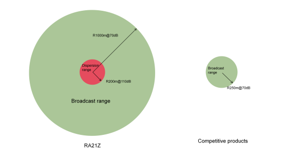 Con un 154 dB de SPL pico y 144 dB de SPL continuo , el RA21Z supera los niveles típicos de la industria. Su potencia acústica efectiva es 4–8 veces la de los productos competidores (cada aumento de 6 dB duplica la energía acústica). Una respuesta de frecuencia amplia de 500 Hz–5 kHz asegura que incluso a 1 km , la salida se mantenga alrededor de 70 dB , preservando la claridad y el detalle del habla mientras mejora la penetración en entornos ruidosos.
