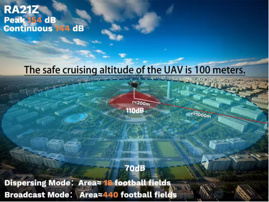 A una altitud típica de crucero del dron de 100 m, el RA21Z mantiene 110 dB dentro de un radio de 200 m —un nivel claramente distinguible por encima del ruido ambiente. Incluso a un radio de 1000 m , sigue dentro del rango efectivo de transmisión. - Dimensión del área: