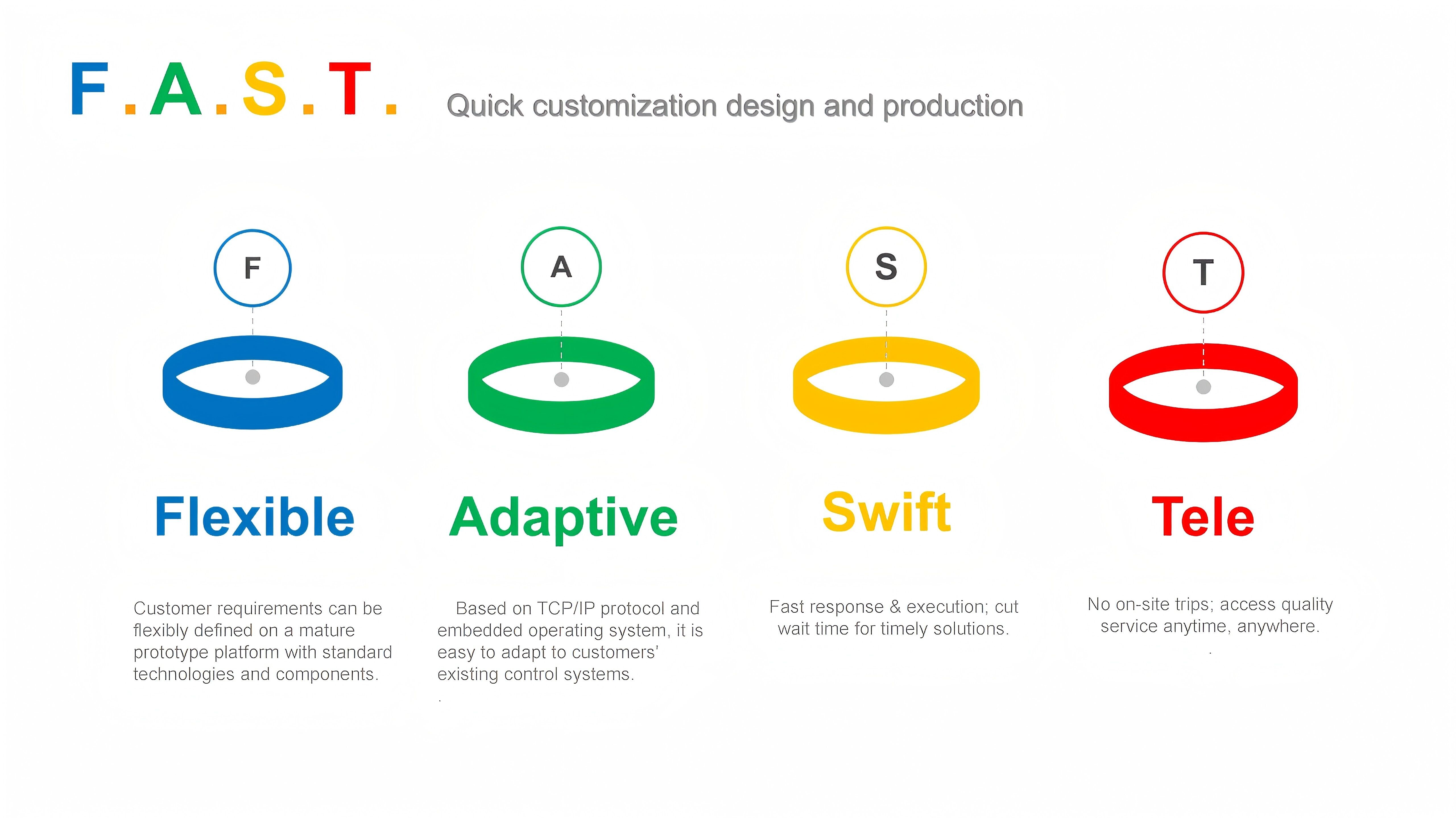 Impulsado por el aumento de las demandas personalizadas y la necesidad creciente de eficiencia en el mercado, las limitaciones y los largos ciclos de los servicios tradicionales de personalización se han vuelto cada vez más evidentes. El Modelo FAST , basado en Flexible (Flexibilidad de Personalización), Adaptativo (Compatibilidad del Sistema), Ágil (Respuesta Rápida) y Tele (Conveniencia Remota) , forma un marco de entrega altamente eficiente de extremo a extremo, desde la definición del requerimiento hasta la implementación final, estableciendo una nueva ventaja competitiva en soluciones personalizadas.