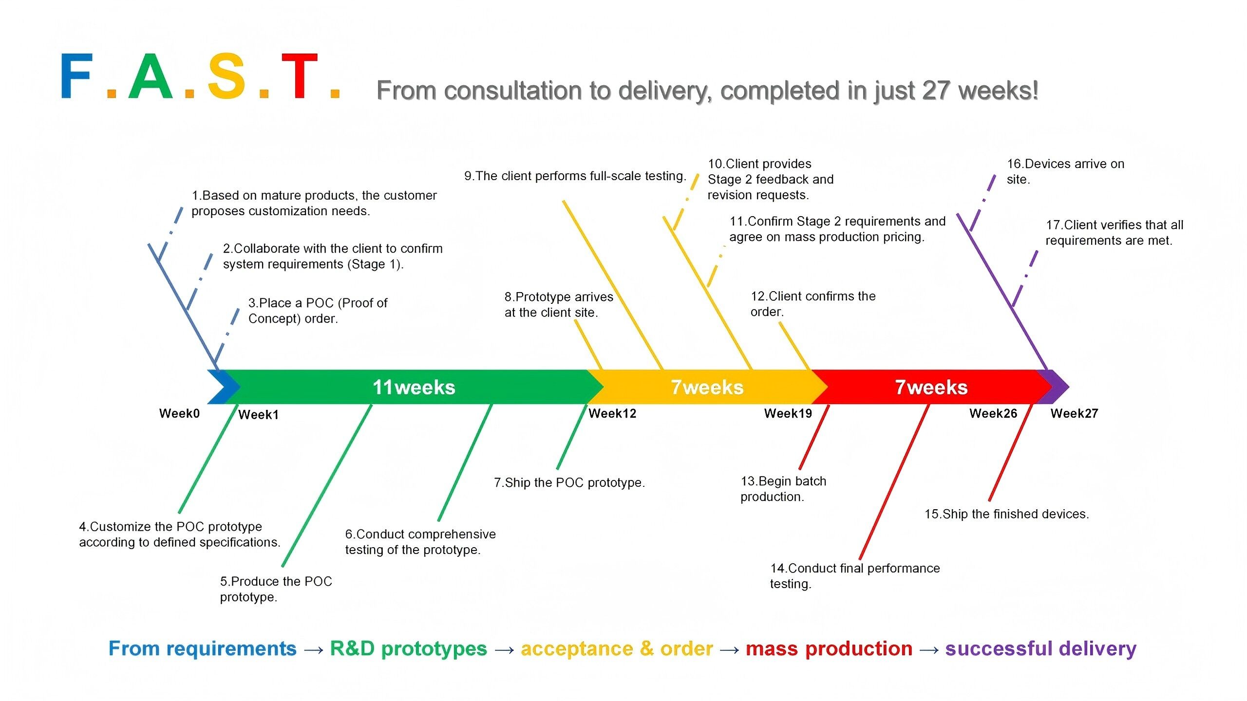 Después de que el usuario envía sus necesidades de personalización basadas en un producto existente, el equipo finaliza rápidamente los requisitos del sistema de Fase-1. En paralelo, se personaliza, fabrica, prueba y envía el pedido de prueba de concepto (POC), permitiendo al usuario completar una evaluación a gran escala.